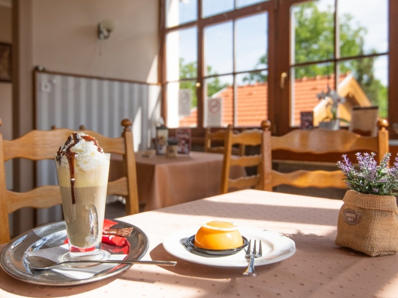 A belsőtérben és a hatalmas kerthelységben van lehetőség a finomságokat elfogyasztani.